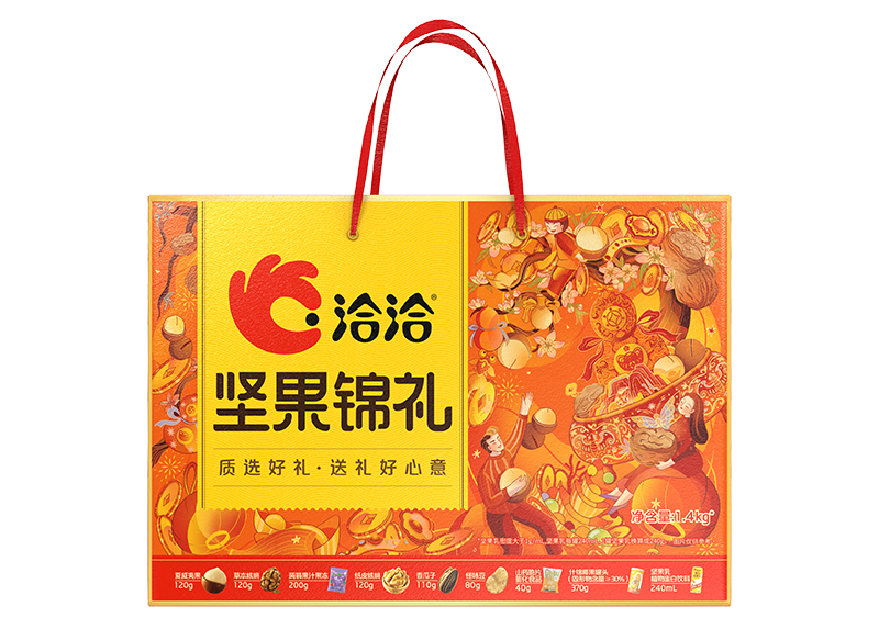 内容物:夏威夷果120g、纸皮核桃120g、草本核桃120g、香瓜子110g、怪味豆80g、蒟蒻果汁果冻200g、山药脆片40g、什锦椰果罐头370g、坚果乳植物蛋白饮料240mL